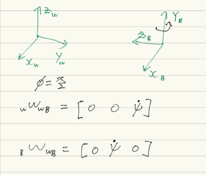 roll = pi/2 상황일때 각속도를 생각해 본다면 world 의 각속도는 z 축의 각속도 회전이지만, body-fixed frame 에서의 각속도는 y 축 회전의 각속도 이다.