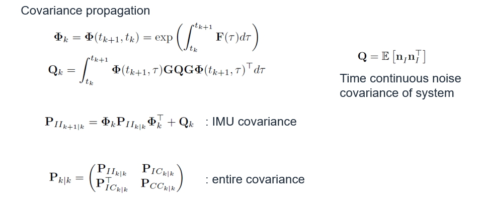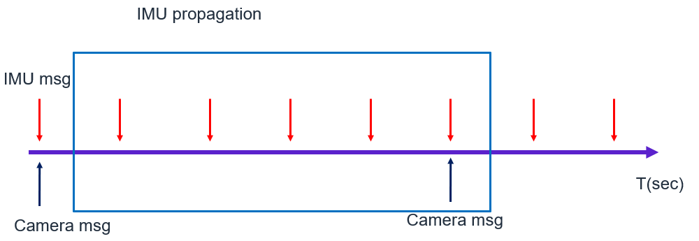 위의 그림과 같이 IMU 의 msg 는 Camera msg 보다 많은 양의 msg 가 들어온다. 따라서 Camera msg 와 다음 Camera msg 사이동안 받은 IMU msg 를 IMU buffer에 저장하고 Camera msg 가 들어오면 imu Propagation 을 진행한다