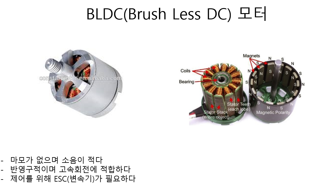 BLDC 모터란 Blush less 즉 교차기가 없다. 따라서 고속회전에도 쓰일수 있으며 드론에 모터로 적합하다. 내부 코일에 자력을 형성하여 회전 하는 원리를 가지고 있다. 내부 구조는 아래와 같다.