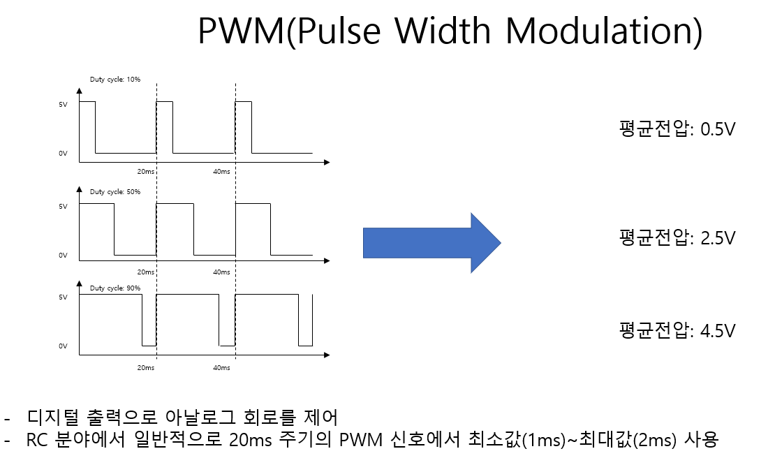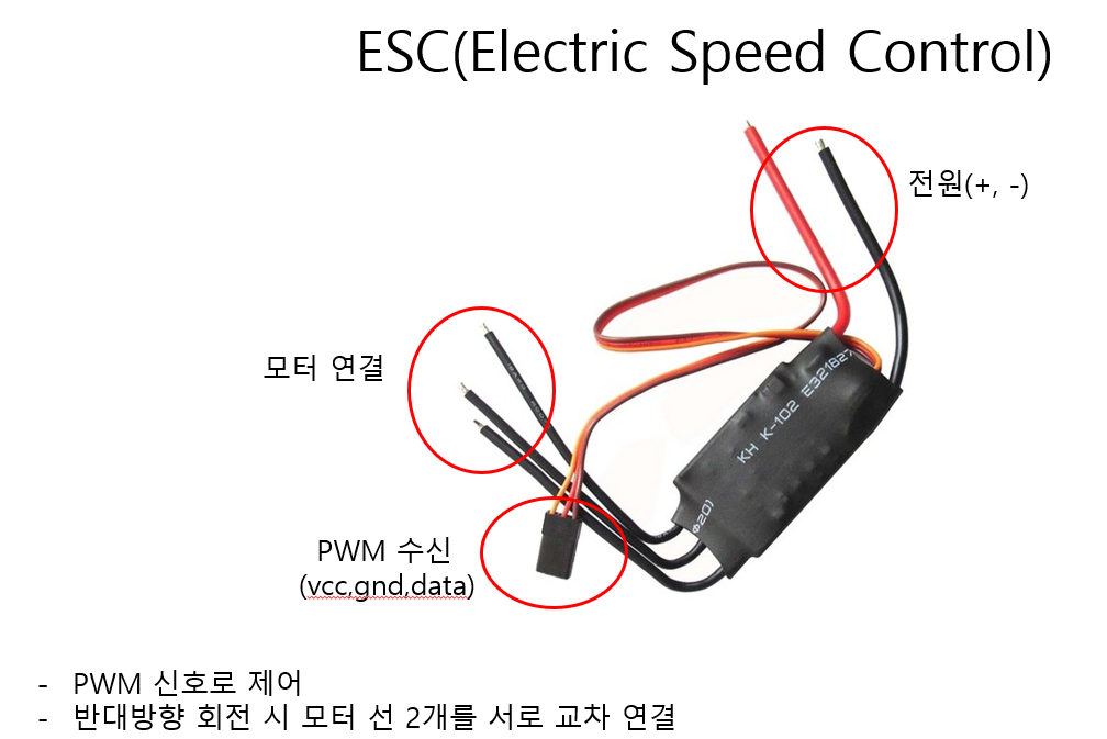 이렇게 모터의 회전을 위하여 코일에 해당되는 전력이 일정 주기로 바뀌어 지기 위해서 ESC 가 필요하다. ESC는 PWM 신호를 수신 받아 회전속도에 맞게 모터에 전극 신호를 준다.