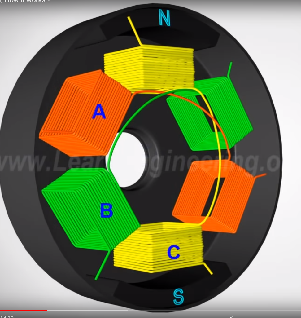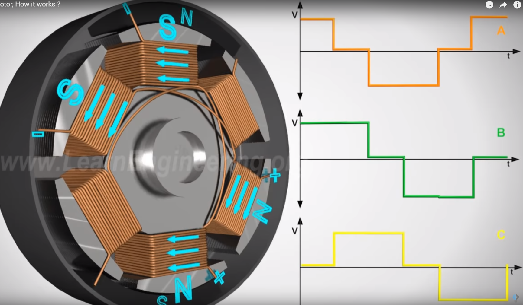 모터에서 3가지 영역으로 나누어 밖의 회전부분과 안의 코일의 자성으로 인한 인력으로 모터가 회전하는것이 주 원리이다. 이것을 가능하게 하기 위해 코일의 전극을 아래 그림과 같이 일정주기로 계속 바꾸어 주어야한다. 그리고 모터의 회전속도에 따라서 코일의 전극의 주기가 달라진다.