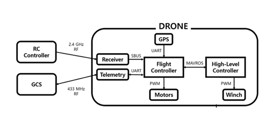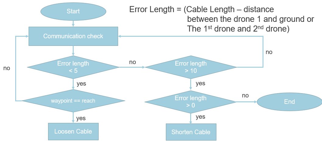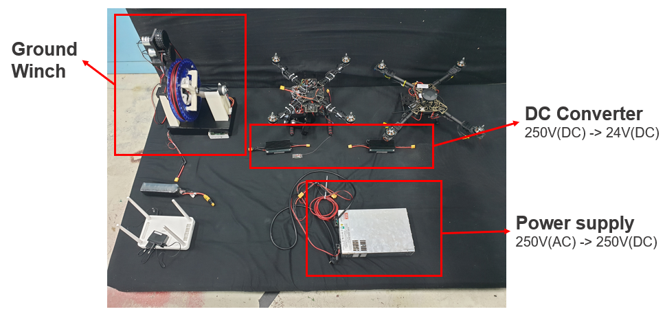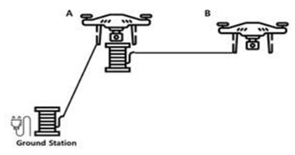 비행 시간 문제를 해결하는 멀티 tethered 드론의 기본 개념은 위 그림에서 확인할 수 있습니다. A 드론은 에너지를 지상 또는 다른 드론에서 전달 받아 다른 드론에 전력을 전달하는 역할을 합니다. 드론과 지상의 거리를 기반으로 cable의 길이를 제어합니다. 본 연구에서는 두 대의 드론으로 지상에서 에너지를 유선으로 공급받아 공중에서 전력을 공급할 수 있는 드론을 개발하는것이 연구 목적입니다.