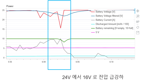 또한 급격한 전압 하락이 발생했습니다. 정확한 요인은 아직 알려지지 않았지만, 드론의 전압이 24V에서 16V로 떨어졌습니다.