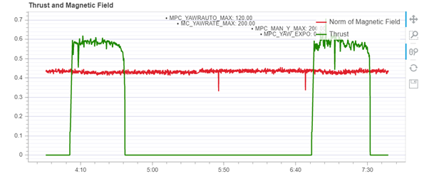 아래 그림과 같이 일정 상황에서 자기장이 지속적으로 발생합니다. 이는 윈치 케이블에 의한 자기장으로 추정됩니다. 또한 주변 자기장으로 인해 초기 보정이 원활하게 진행되지 않았습니다. 따라서 Yaw 축에 대한 추정이 정확하지 않았습니다.