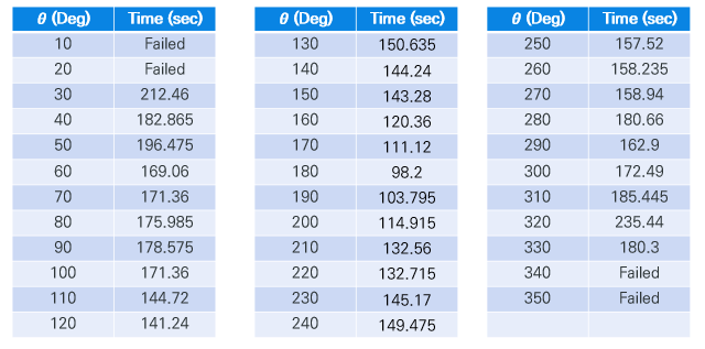 아래는 저희의 실험 결과 입니다. 각도가 30도 부터 330도 까지 드론이 목표지점에 도달하는것을 알 수 있습니다.
