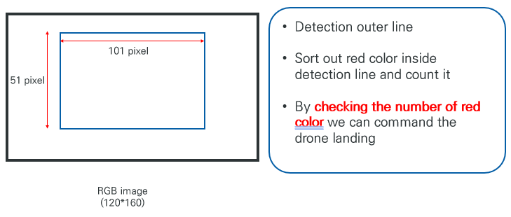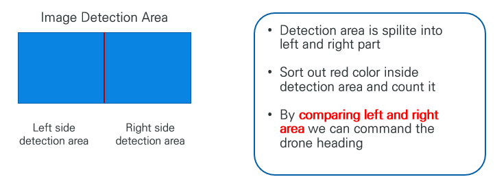 아래 그림과 같이 탐지 부분에서의 왼쪽과 오른쪽의 영역을 탐지하여, dominant 한 부분의 방향으로 회전을 하여 드론의 heading 과 라인을 맞춥니다