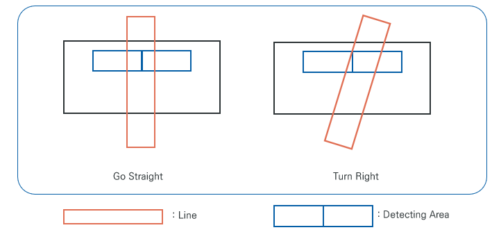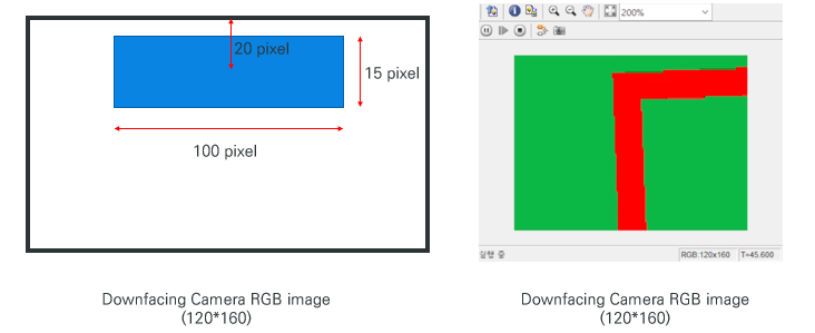 이미지는 아래 그림과 같이 downfacing 카메라에서 찍은 이미지에서 윗부분의 파랑 부분을 측정하여 어떤 방향으로 회전을 해야하는지를 감지 합니다.