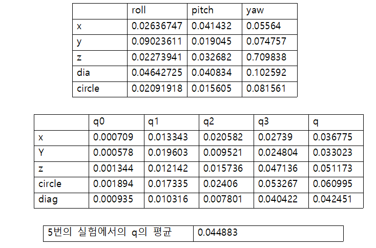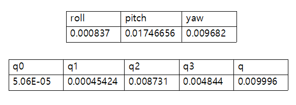 X Y Z 의 값에 0 이 아닌 값이 나오게 된다. (1-w), X, Y, Z의 값의 제곱 평균 제곱근(RMS)을 구하여 이를 오차로 측정하였다.